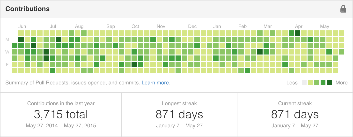 FYI, the GitHub streak can be manipulated.[0] My apologies for the lack of documentation. Basically, since you can modify the author and commit date in Git, you can trick GitHub into thinking you've committed something several years in the past[1] or the future[2]. Some people have written things that allow you even write messages into the commit graph[3].